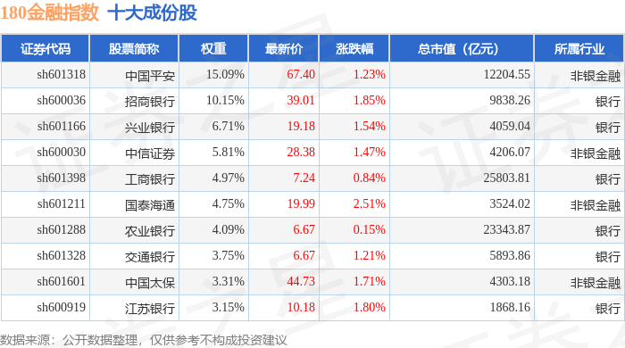 证券之星消息,2月4日,180金融(000018)指数报收于5669.54点,涨1.37%,成交488.01亿元,换手率0.29%。当日该指数成份股中,上涨的有43家,国泰海通以2.51%的涨幅领涨。