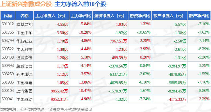 资金流向方面,上证新兴(000067)指数成份股当日主力资金净流出合计42.37亿元,游资资金净流入合计24.23亿元,散户资金净流入合计18.14亿元。成份股资金流向详情见下表: