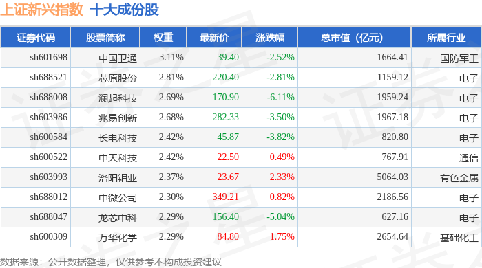 证券之星消息,2月4日,上证新兴(000067)指数报收于9407.5点,跌0.28%,成交1428.53亿元,换手率1.51%。当日该指数成份股中,上涨的有25家,通威股份以4.82%的涨幅领涨,下跌的有25家,澜起科技以6.11%的跌幅领跌。