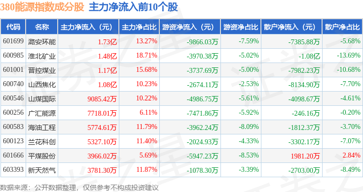 资金流向方面,380能源(000104)指数成份股当日主力资金净流入合计7.04亿元,游资资金净流出合计4.56亿元,散户资金净流出合计2.48亿元。成份股资金流向详情见下表: