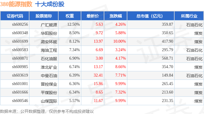 380能源(000104)指数十大成份股详情如下: