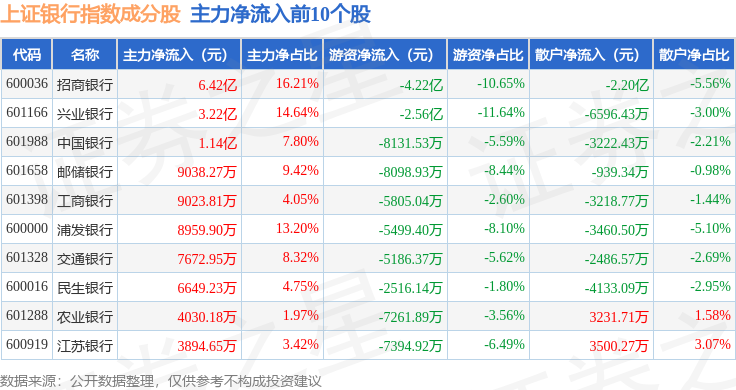 资金流向方面,上证银行(000134)指数成份股当日主力资金净流入合计15.27亿元,游资资金净流出合计13.36亿元,散户资金净流出合计1.9亿元。成份股资金流向详情见下表: