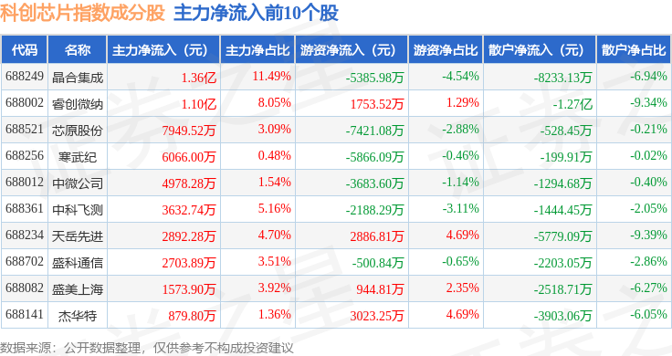 资金流向方面,科创芯片(000685)指数成份股当日主力资金净流出合计34.77亿元,游资资金净流入合计21.64亿元,散户资金净流入合计13.13亿元。成份股资金流向详情见下表: