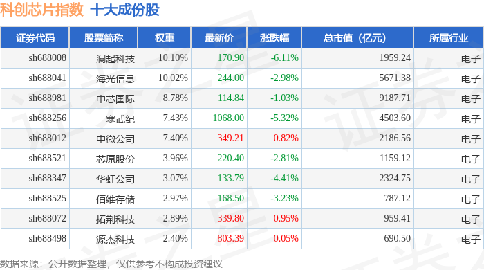 证券之星消息,2月4日,科创芯片(000685)指数报收于2907.99点,跌2.2%,成交729.48亿元,换手率1.94%。当日该指数成份股中,上涨的有8家,杰华特以4.86%的涨幅领涨,下跌的有42家,仕佳光子以6.68%的跌幅领跌。
