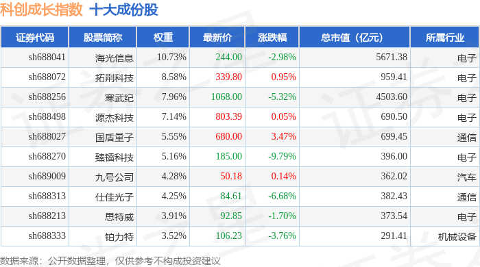 科创成长(000690)指数十大成份股详情如下: