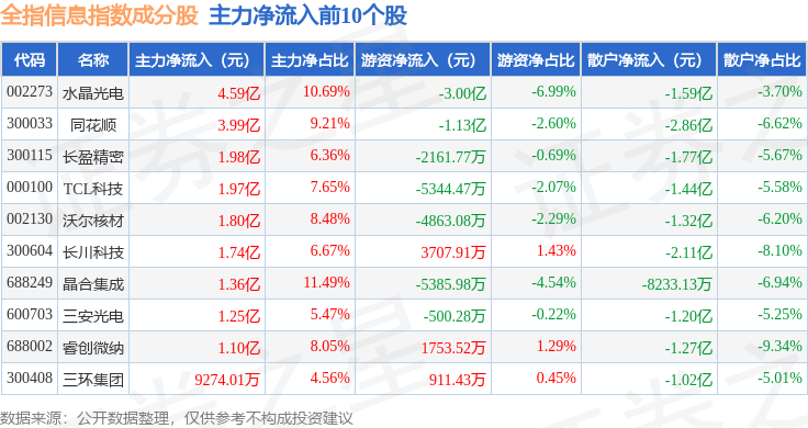 资金流向方面,全指信息(000993)指数成份股当日主力资金净流出合计210.01亿元,游资资金净流入合计77.26亿元,散户资金净流入合计132.75亿元。成份股资金流向详情见下表: