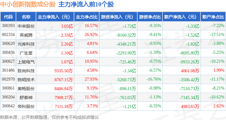 资金流向方面,中小创新(399015)指数成份股当日主力资金净流出合计103.6亿元,游资资金净流入合计25.2亿元,散户资金净流入合计78.4亿元。成份股资金流向详情见下表: