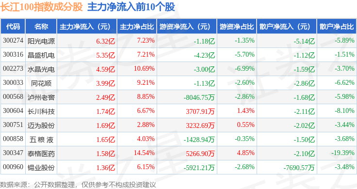 资金流向方面,长江100(399278)指数成份股当日主力资金净流出合计85.24亿元,游资资金净流入合计29.75亿元,散户资金净流入合计55.49亿元。成份股资金流向详情见下表: