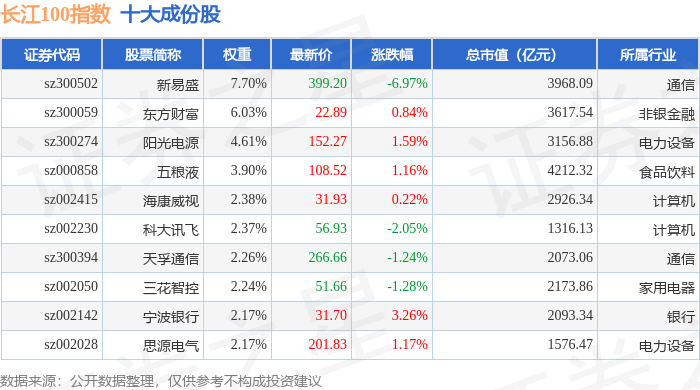 证券之星消息,2月4日,长江100(399278)指数报收于2246.52点,跌0.31%,成交1993.32亿元,换手率2.1%。当日该指数成份股中,上涨的有63家,晶盛机电以12.97%的涨幅领涨,下跌的有37家,新易盛以6.97%的跌幅领跌。