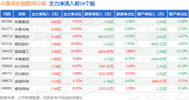 资金流向方面,小盘成长(399376)指数成份股当日主力资金净流出合计33.84亿元,游资资金净流入合计2.39亿元,散户资金净流入合计31.31亿元。成份股资金流向详情见下表: