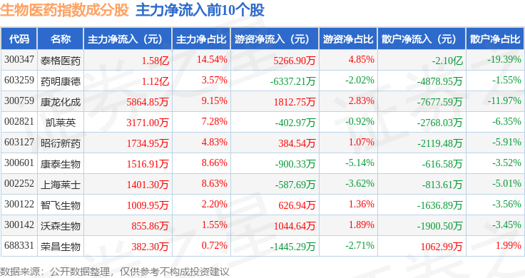 资金流向方面,生物医药(399441)指数成份股当日主力资金净流入合计2.26亿元,游资资金净流入合计2.02亿元,散户资金净流出合计4.28亿元。成份股资金流向详情见下表: