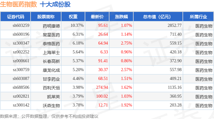 证券之星消息,2月4日,生物医药(399441)指数报收于2207.4点,涨1.14%,成交125.97亿元,换手率1.05%。当日该指数成份股中,上涨的有27家,泰格医药以2.75%的涨幅领涨,下跌的有3家,特宝生物以2.51%的跌幅领跌。