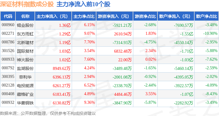 资金流向方面,深证材料(399614)指数成份股当日主力资金净流出合计54.65亿元,游资资金净流入合计10.99亿元,散户资金净流入合计43.66亿元。成份股资金流向详情见下表: