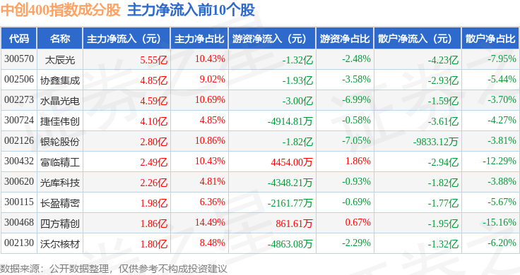 资金流向方面,中创400(399624)指数成份股当日主力资金净流出合计190.38亿元,游资资金净流入合计73.39亿元,散户资金净流入合计116.99亿元。成份股资金流向详情见下表: