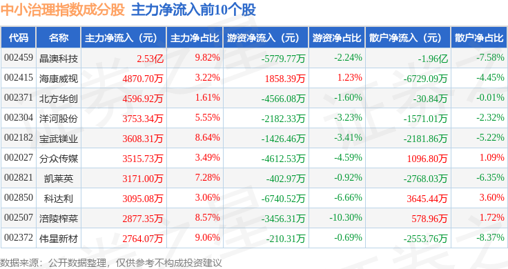 资金流向方面,中小治理(399650)指数成份股当日主力资金净流出合计26.98亿元,游资资金净流入合计6.64亿元,散户资金净流入合计20.33亿元。成份股资金流向详情见下表: