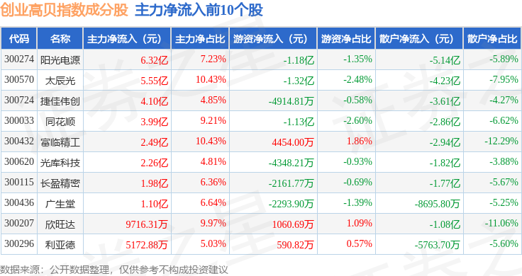 资金流向方面,创业高贝(399694)指数成份股当日主力资金净流出合计164.44亿元,游资资金净流入合计98.99亿元,散户资金净流入合计65.45亿元。成份股资金流向详情见下表: