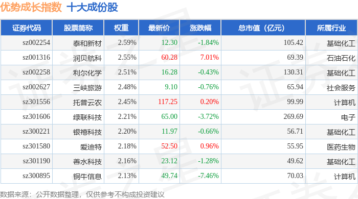 证券之星消息,2月4日,优势成长(399698)指数报收于56371.12点,涨0.73%,成交105.39亿元,换手率3.21%。当日该指数成份股中,上涨的有33家,我爱我家以10.06%的涨幅领涨,下跌的有17家,铜牛信息以7.46%的跌幅领跌。