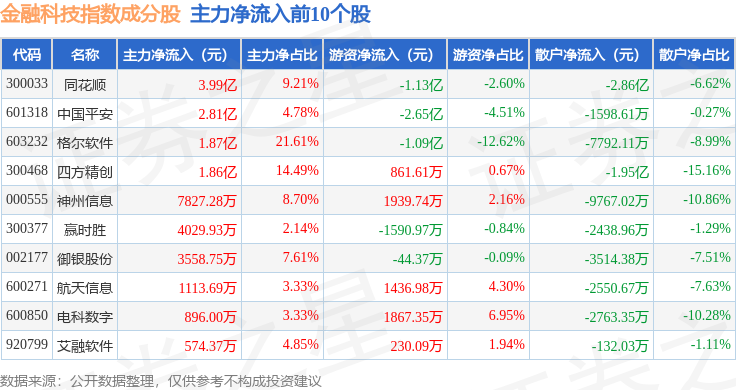 资金流向方面,金融科技(399699)指数成份股当日主力资金净流出合计13.3亿元,游资资金净流入合计3.2亿元,散户资金净流入合计10.18亿元。成份股资金流向详情见下表: