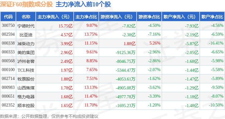 资金流向方面,深证F60(399701)指数成份股当日主力资金净流入合计15.18亿元,游资资金净流出合计7.68亿元,散户资金净流出合计7.49亿元。成份股资金流向详情见下表: