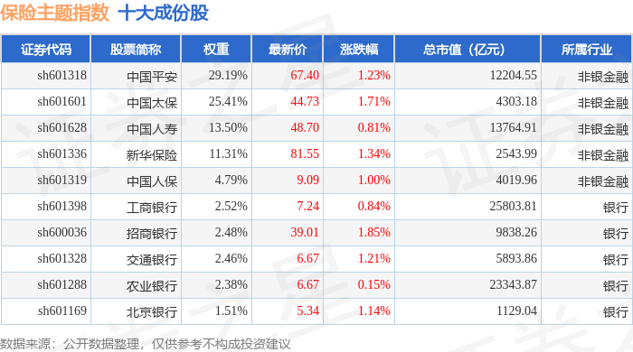 保险主题(399809)指数十大成份股详情如下: