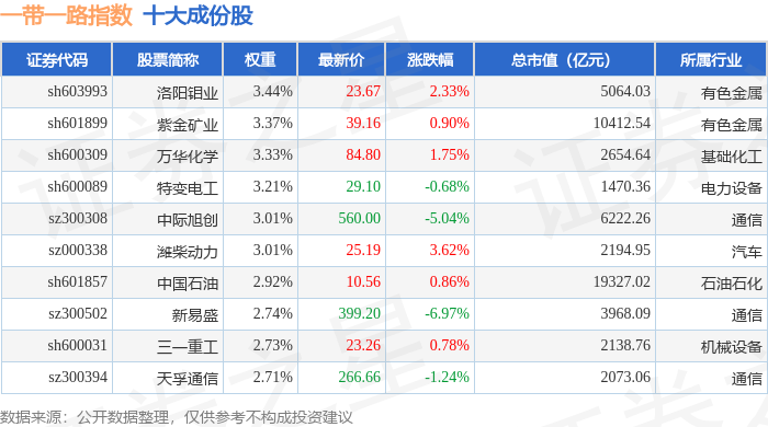 一带一路(399991)指数十大成份股详情如下: