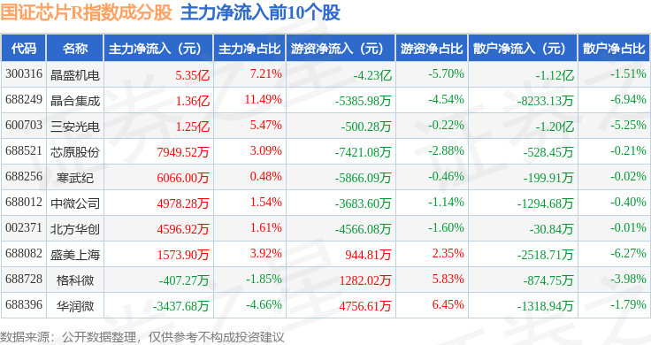 资金流向方面,国证芯片R(480017)指数成份股当日主力资金净流出合计43.05亿元,游资资金净流入合计16.06亿元,散户资金净流入合计26.99亿元。成份股资金流向详情见下表: