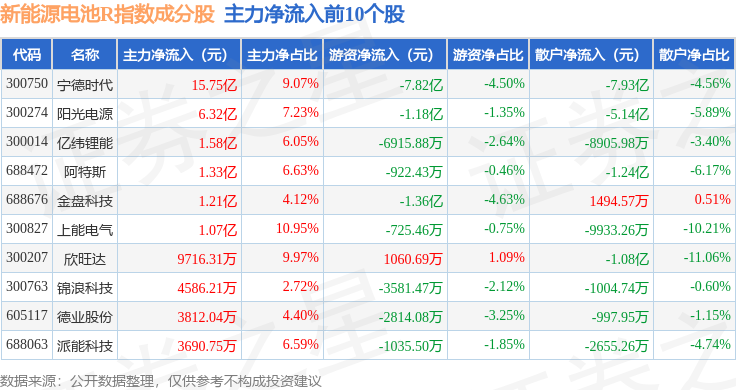 资金流向方面,新能源电池R(480027)指数成份股当日主力资金净流入合计18.11亿元,游资资金净流出合计9.06亿元,散户资金净流出合计9.05亿元。成份股资金流向详情见下表: