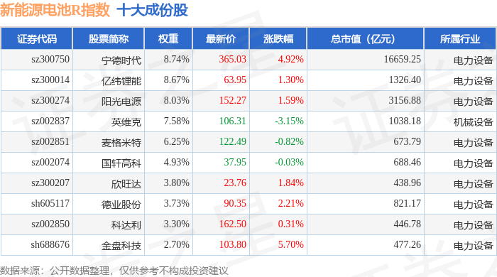 新能源电池R(480027)指数十大成份股详情如下: