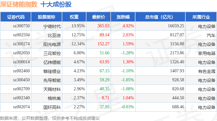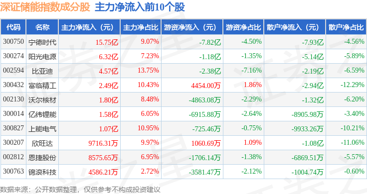 资金流向方面,深证储能(970036)指数成份股当日主力资金净流入合计14.92亿元,游资资金净流出合计6.82亿元,散户资金净流出合计8.1亿元。成份股资金流向详情见下表: