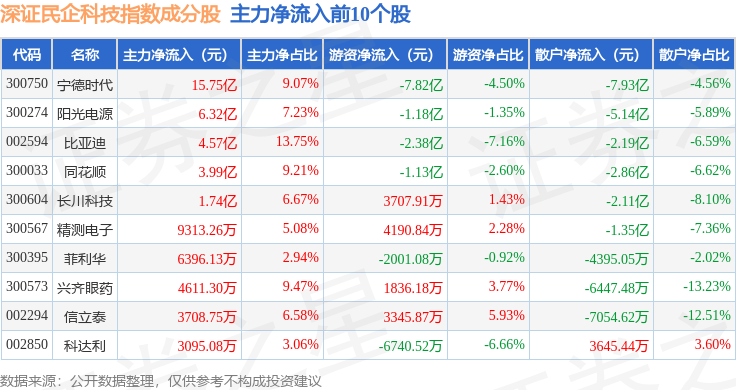 资金流向方面,深证民企科技(970059)指数成份股当日主力资金净流入合计12.11亿元,游资资金净流出合计1.64亿元,散户资金净流出合计10.47亿元。成份股资金流向详情见下表: