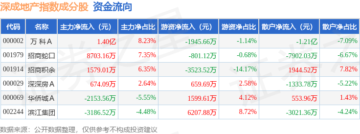 资金流向方面,深成地产(971001)指数成份股当日主力资金净流入合计1.96亿元,游资资金净流入合计2196.86万元,散户资金净流出合计2.18亿元。成份股资金流向详情见下表: