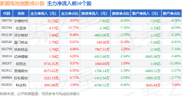 资金流向方面,新能电池(980032)指数成份股当日主力资金净流入合计11.71亿元,游资资金净流出合计6.46亿元,散户资金净流出合计5.4亿元。成份股资金流向详情见下表: