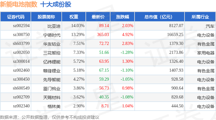 证券之星消息,2月4日,新能电池(980032)指数报收于15675.22点,涨1.24%,成交606.14亿元,换手率2.22%。当日该指数成份股中,上涨的有20家,宁德时代以4.92%的涨幅领涨,下跌的有10家,三花智控以1.28%的跌幅领跌。