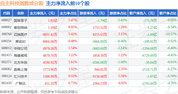资金流向方面,自主科技(980033)指数成份股当日主力资金净流出合计53.15亿元,游资资金净流入合计26.61亿元,散户资金净流入合计26.54亿元。成份股资金流向详情见下表: