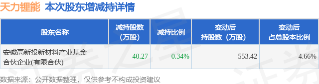 证券之星消息,2月4日天力锂能发布公告《天力锂能:天力锂能集团股份有限公司关于股东减持计划期限届满暨实施结果的公告》,其股东安徽高新投新材料产业基金合伙企业(有限合伙)于2025年11月8日至2025年12月26日间合计减持40.27万股,占公司目前总股本的0.3391%,变动期间该股股价下跌6.62%,截止12月26日收盘报32.29元。