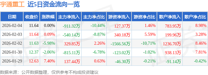 2月4日的资金流向数据方面,主力资金净流出911.32万元,占总成交额10.44%,游资资金净流入127.37万元,占总成交额1.46%,散户资金净流入783.95万元,占总成交额8.98%。
