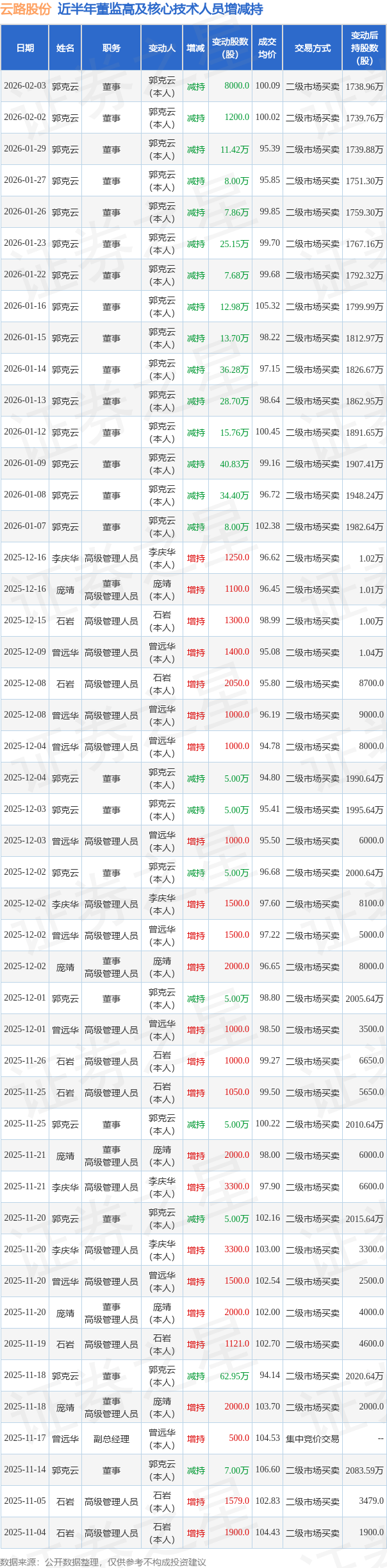 云路股份近半年内的董监高及核心技术人员增减持详情如下:
