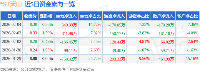 证券之星消息,截至2026年2月4日收盘,*ST天山(300313)报收于8.3元,下跌0.36%,换手率1.41%,成交量2.78万手,成交额2312.15万元。