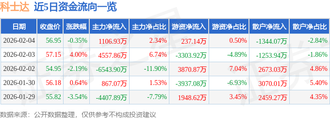 证券之星消息,截至2026年2月4日收盘,科士达(002518)报收于56.95元,下跌0.35%,换手率1.49%,成交量8.4万手,成交额4.73亿元。