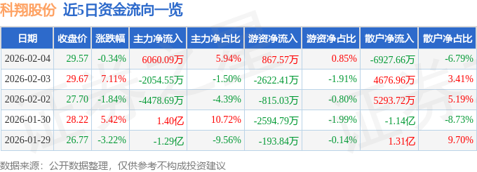 证券之星消息,截至2026年2月4日收盘,科翔股份(300903)报收于29.57元,下跌0.34%,换手率10.69%,成交量35.12万手,成交额10.2亿元。