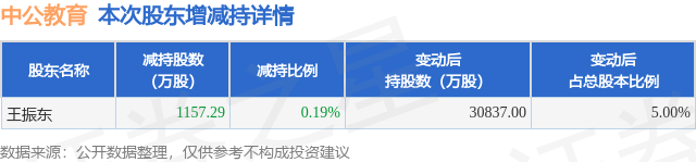 证券之星消息,2月4日中公教育发布公告《中公教育:关于股东权益变动触及1%暨权益变动至5%以下的提示性公告》,其股东王振东于2026年1月15日至2026年2月4日间合计减持1157.29万股,占公司目前总股本的0.1876%,变动期间该股股价下跌13.51%,截止2月4日收盘报2.88元。