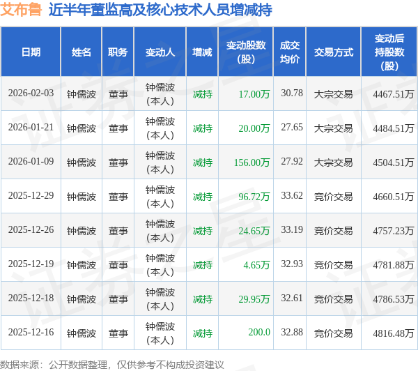 艾布鲁近半年内的董监高及核心技术人员增减持详情如下: