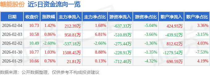证券之星消息,截至2026年2月4日收盘,赣能股份(000899)报收于10.73元,上涨1.42%,换手率1.21%,成交量11.83万手,成交额1.27亿元。