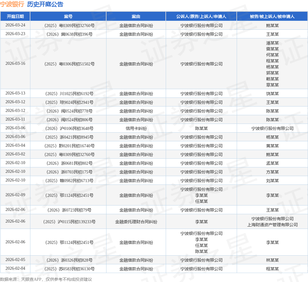 案号:(2025)沪0115民初139233号根据统计,近一年内以宁波银行股份有限公司为当事人的历史开庭公告有1474则,其中案由为“金融借款合同纠纷”的公告以1306则居首,其次为“借款”有112则,“借款合同纠纷”有24则。历史开庭公告(前20条)如下: