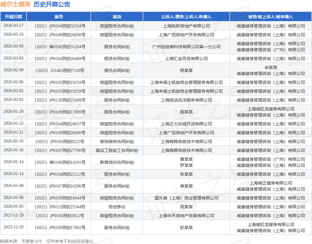 案号:(2025)沪0105民初19259号根据统计,近一年内以威康健身管理咨询(上海)有限公司为当事人的历史开庭公告有1251则,其中案由为“服务合同纠纷”的公告以1033则居首,其次为“教育培训合同纠纷”有55则,“房屋租赁合同纠纷”有45则。历史开庭公告(前20条)如下: