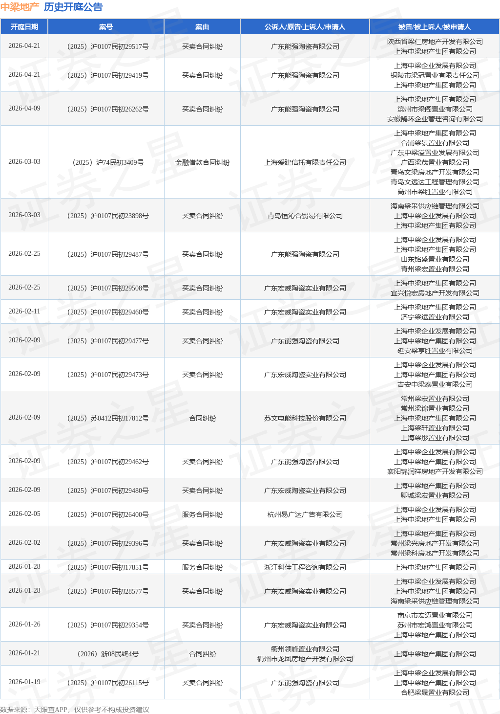 案号:(2025)沪0107民初26400号根据统计,近一年内以上海中梁地产集团有限公司为当事人的历史开庭公告有154则,其中案由为“商品房预售合同纠纷”的公告以63则居首,其次为“买卖合同纠纷”有30则,“建设工程施工合同纠纷”有16则。历史开庭公告(前20条)如下:
