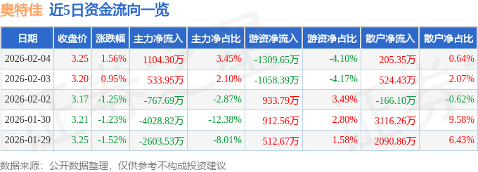 证券之星消息,截至2026年2月4日收盘,奥特佳(002239)报收于3.25元,上涨1.56%,换手率3.04%,成交量99.16万手,成交额3.2亿元。