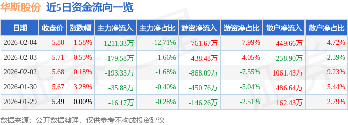 证券之星消息,截至2026年2月4日收盘,华斯股份(002494)报收于5.8元,上涨1.58%,换手率5.77%,成交量16.54万手,成交额9533.19万元。