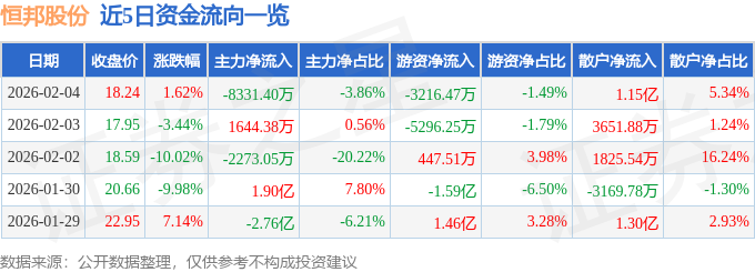 证券之星消息,截至2026年2月4日收盘,恒邦股份(002237)报收于18.24元,上涨1.62%,换手率9.9%,成交量118.03万手,成交额21.61亿元。