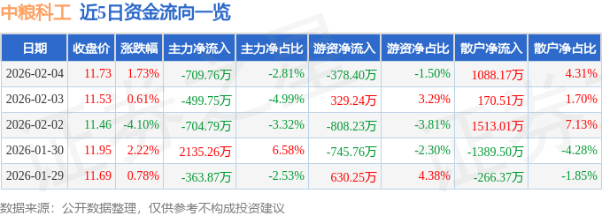 证券之星消息,截至2026年2月4日收盘,中粮科工(301058)报收于11.73元,上涨1.73%,换手率4.19%,成交量21.44万手,成交额2.53亿元。